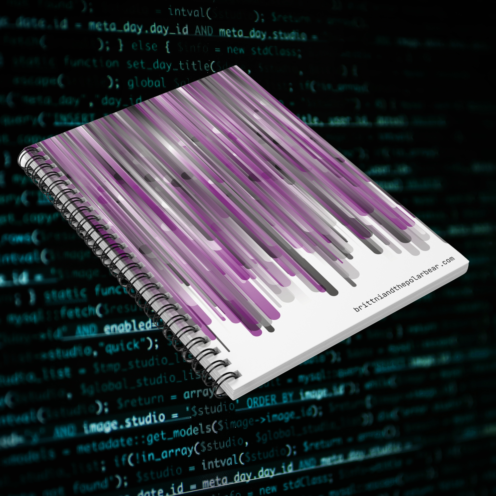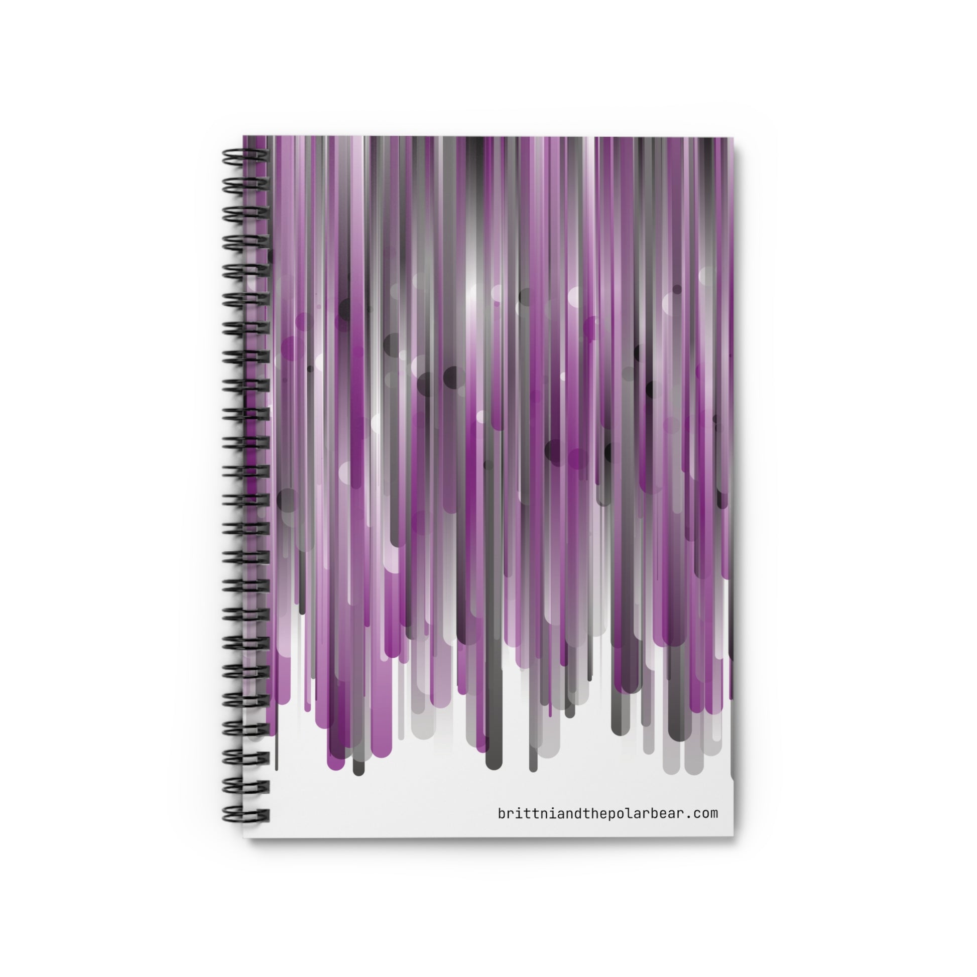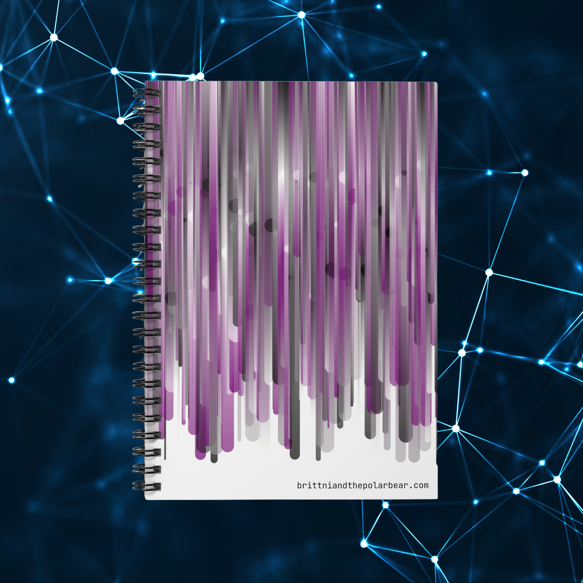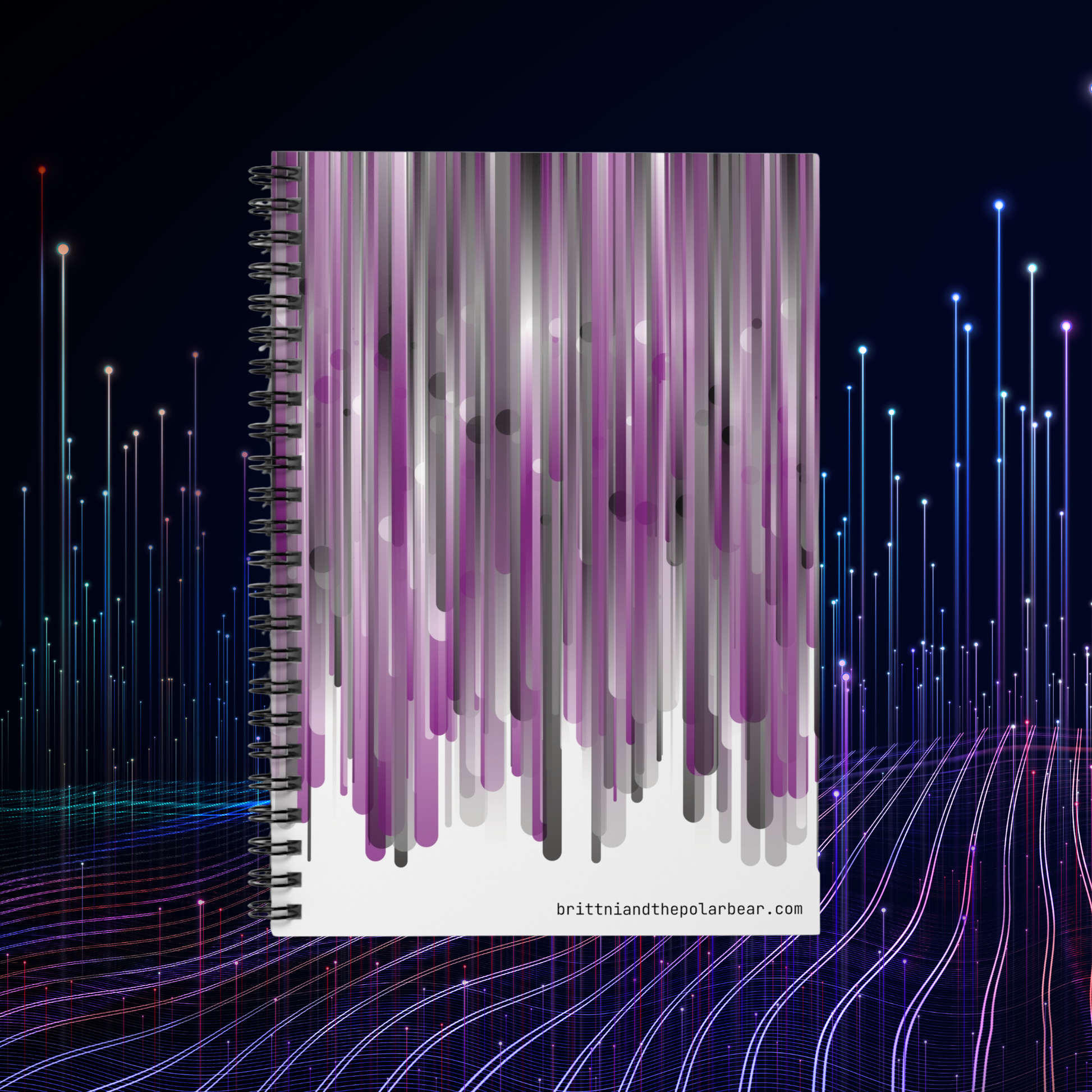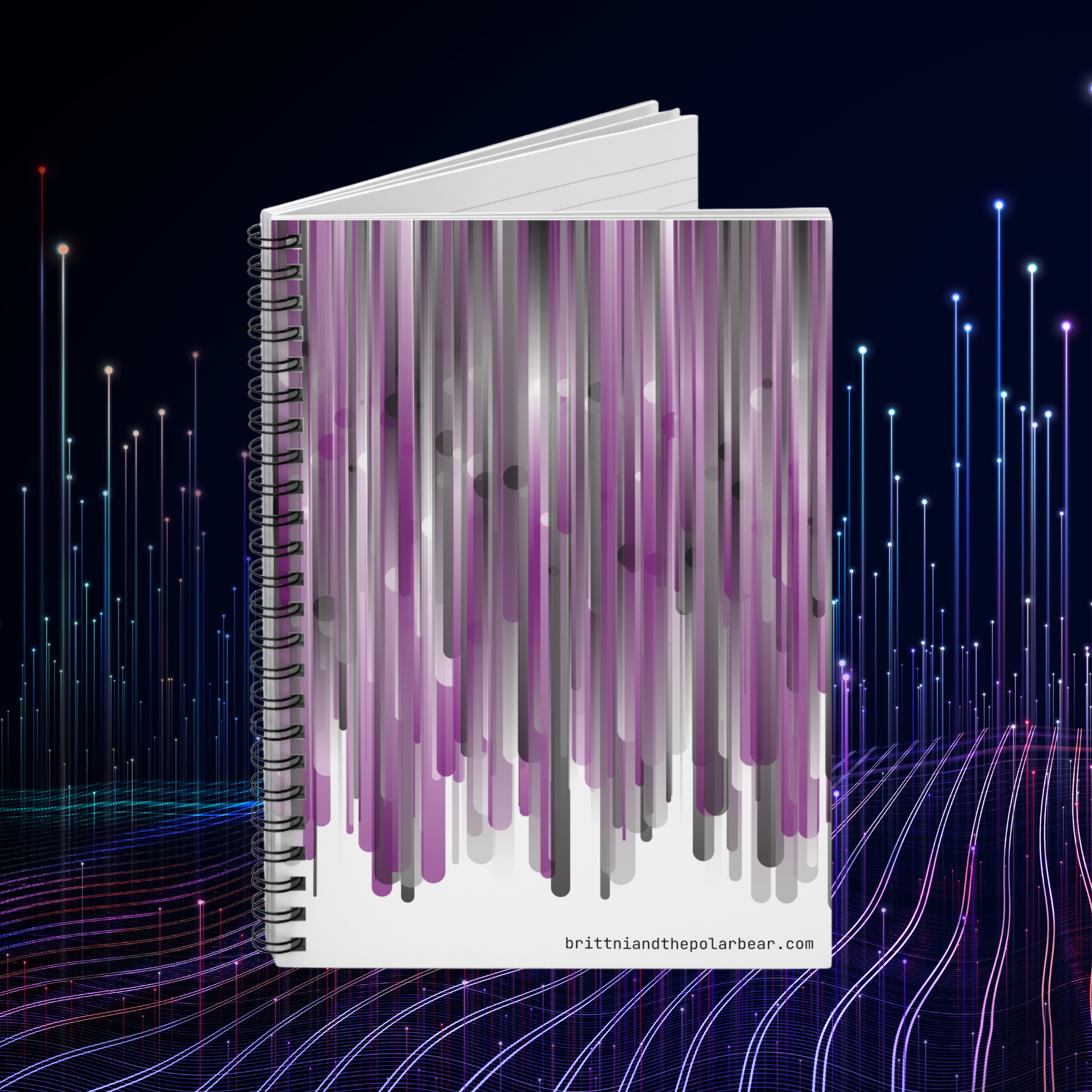 Shopping lists, to-do lists, notes, or poems - this 118 page spiral notebook with rule lined paper is a perfect companion in everyday life. Featuring a shimmering purple, black, and grey color scheme, the cover art for this notebook was designed using original TypeScript code written by azurepolarbear, a code artist and software engineer. This notebook features a striking abstract pattern with vertical lines of varying lengths that evoke the dramatic silhouette of a city's towering buildings against the horizon. With a durable printed cover, artists, creatives, and students will be proud to carry it everywhere. It makes a great companion for personal reflection, brainstorming sessions, or maintaining an organized life. Whether it's for back-to-school season, a birthday gift, or a thoughtful gesture during the holidays, this notebook is a delightful addition to any stationery collection.