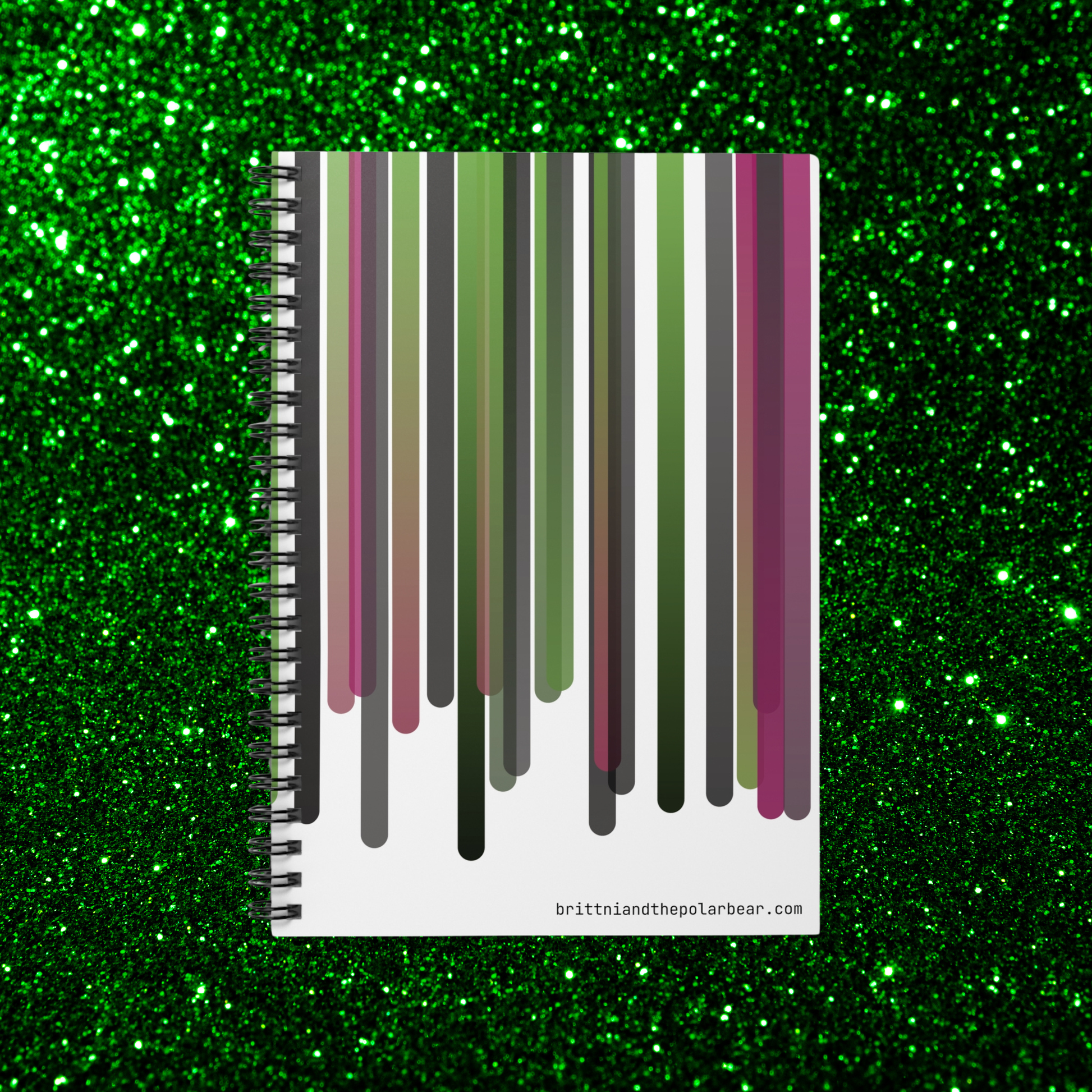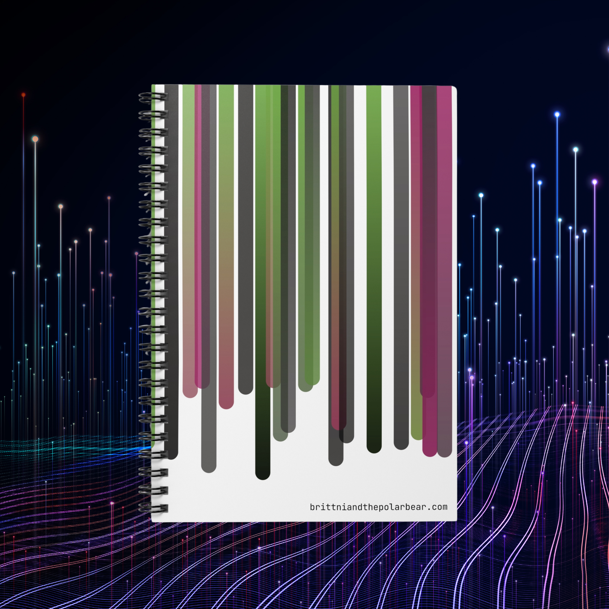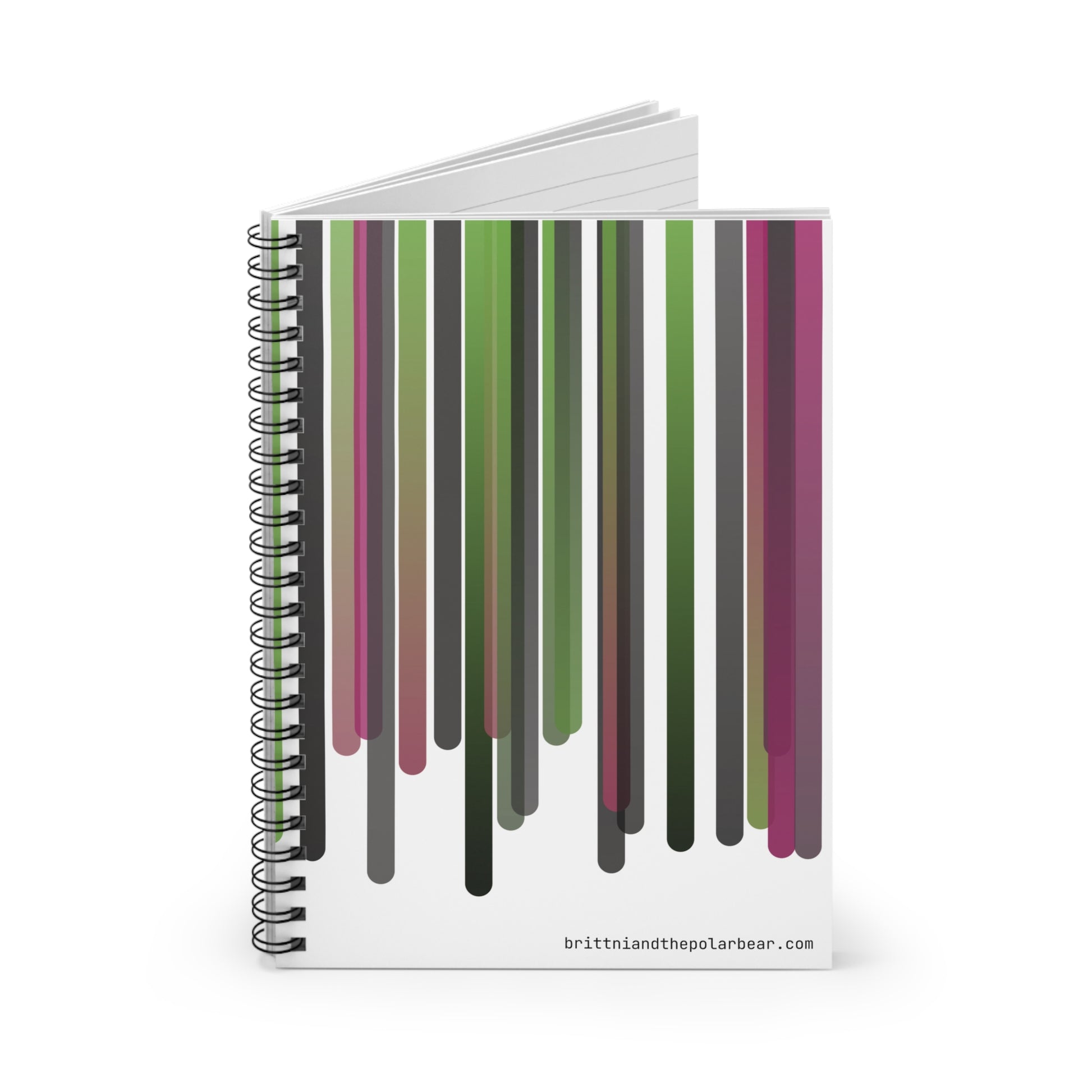Shopping lists, to-do lists, notes, or poems - this 118-page spiral notebook with rule lined paper is a perfect companion in everyday life. Featuring a stunning pink, green, and black color scheme, the cover art for this notebook was designed using original TypeScript code written by azurepolarbear, a code artist and software engineer. This notebook features vertical lines in a palette of sage greens, charcoal grays, and rose pinks, each line flowing downward with subtle gradient transitions that give the artwork a modern aesthetic. With a durable printed cover, artists, creatives, and students will be proud to carry it everywhere. It makes a great companion for personal reflection, brainstorming sessions, or maintaining an organized life. Whether it's for back-to-school season, a birthday gift, or a thoughtful gesture during the holidays, this notebook is a delightful addition to any stationery collection.