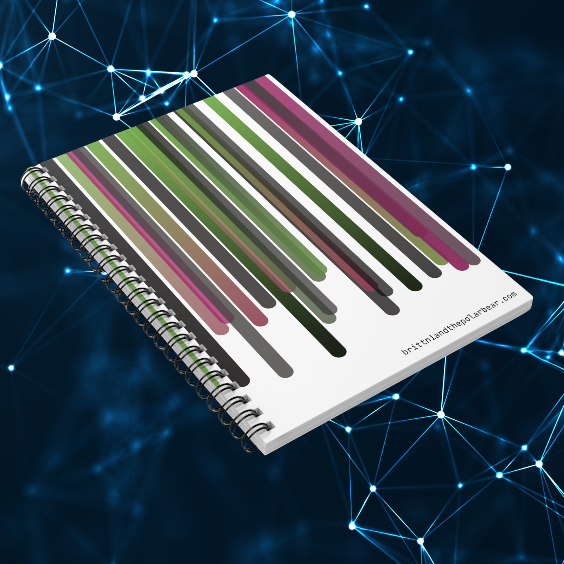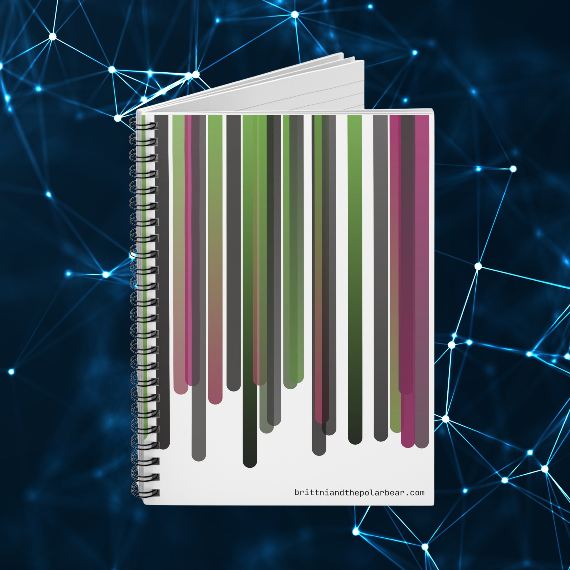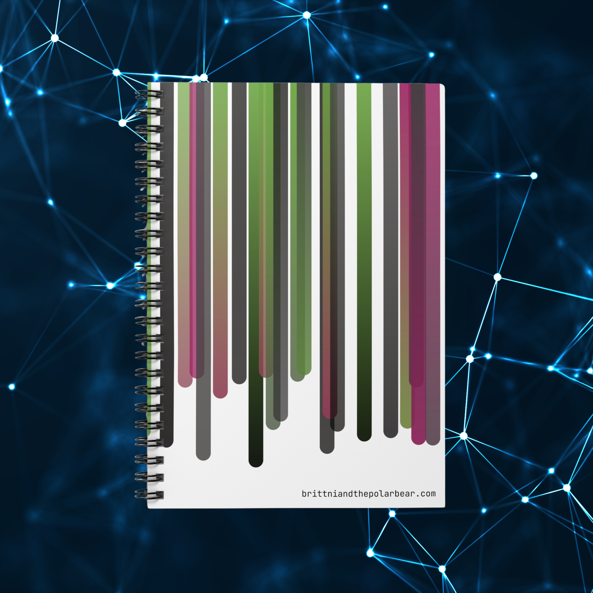 Shopping lists, to-do lists, notes, or poems - this 118-page spiral notebook with rule lined paper is a perfect companion in everyday life. Featuring a stunning pink, green, and black color scheme, the cover art for this notebook was designed using original TypeScript code written by azurepolarbear, a code artist and software engineer. This notebook features vertical lines in a palette of sage greens, charcoal grays, and rose pinks, each line flowing downward with subtle gradient transitions that give the artwork a modern aesthetic. With a durable printed cover, artists, creatives, and students will be proud to carry it everywhere. It makes a great companion for personal reflection, brainstorming sessions, or maintaining an organized life. Whether it's for back-to-school season, a birthday gift, or a thoughtful gesture during the holidays, this notebook is a delightful addition to any stationery collection.